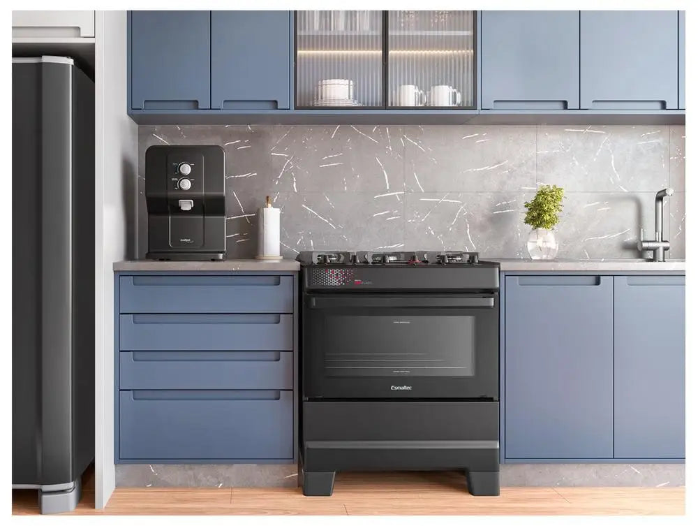 Sophistication and agility for your day to day with the 5 Burner stove Esmaltec Ideal Top Glass. With elegant black finish and a modern tempered glass table, this stove not only beautifies your kitchen, but also makes it easy to clean. The Analog Top Control panel offers more safety and comfort as the controls are located at the top of the stove, out of reach of children. Auto-firing makes use more convenient and faster, eliminating the need for matches or lighters. Prepare recipes for the whole family in the spacious 84L oven, which features Easy Clean technology. Its special inner lining prevents the accumulation of fat, making cleaning much simpler. And the individual tremps ensure greater stability for your pans.